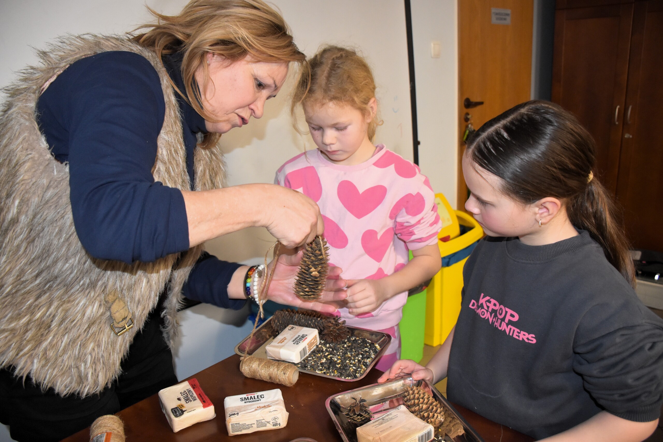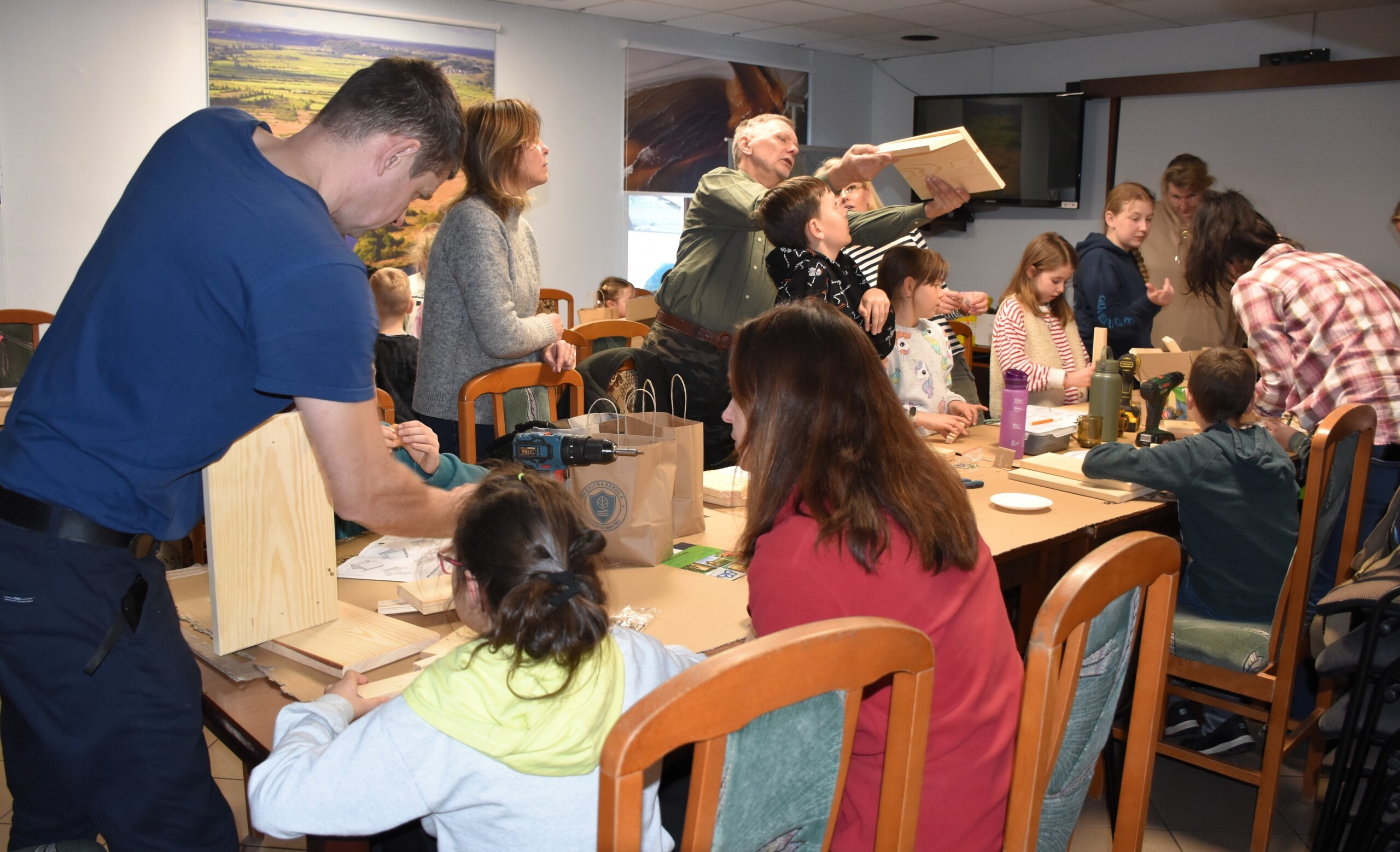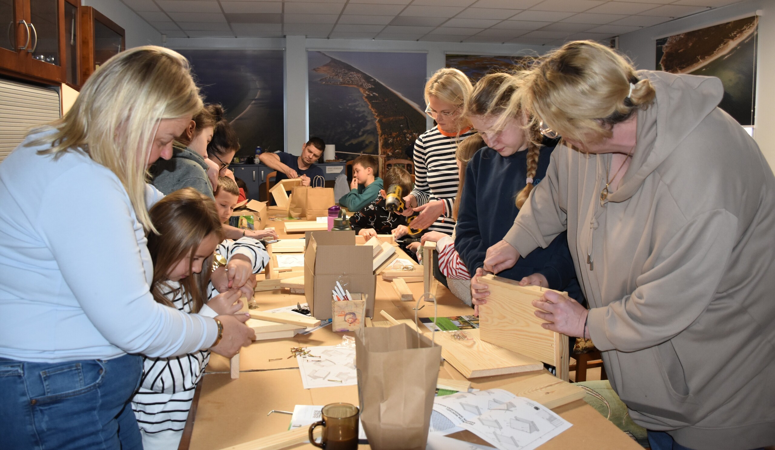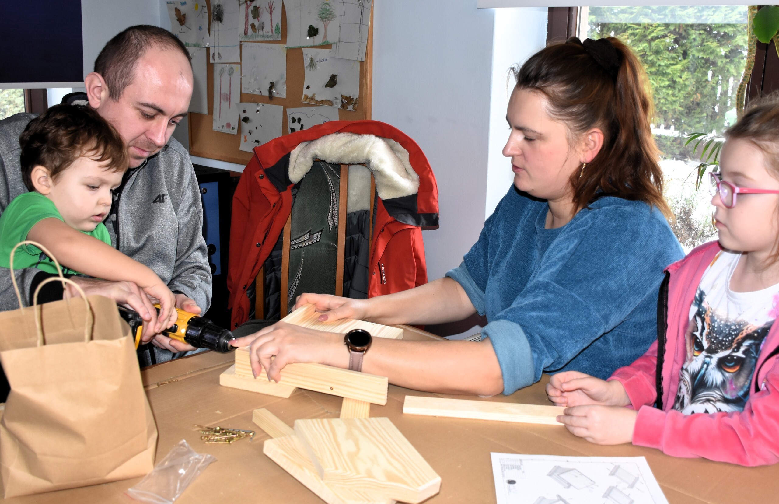 Po teorii przyszedł czas na praktykę i przystąpiono do budowy karmników. Wszyscy ochoczo zabrali się do pracy. Wkrętarki poszły w ruch, a śrubki i wkręty szybko znajdowały przypisane sobie miejsca. Z desek bardzo szybko powstawały coraz to pełniejsze karmniki. Na zakończenie zarówno na twarzach najmłodszych, jak i starszych widać było zadowolenie i dumę z wykonanego zadania. Gotowe karmniki uzupełnione zostały o ptasie smakołyki, czyli szyszki tłuszczowe z nasionami.