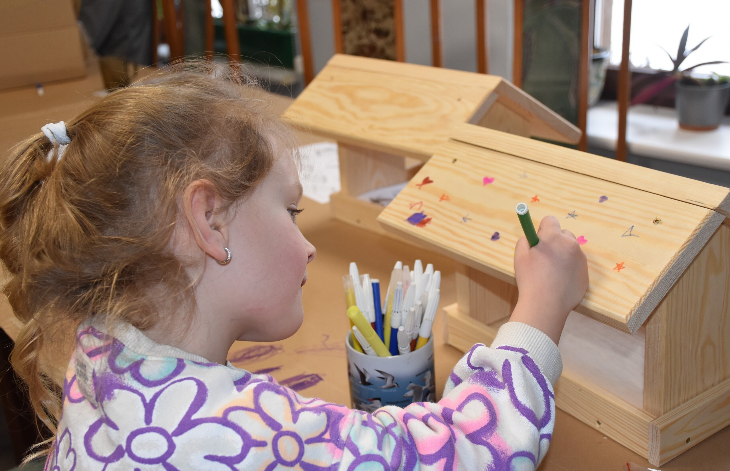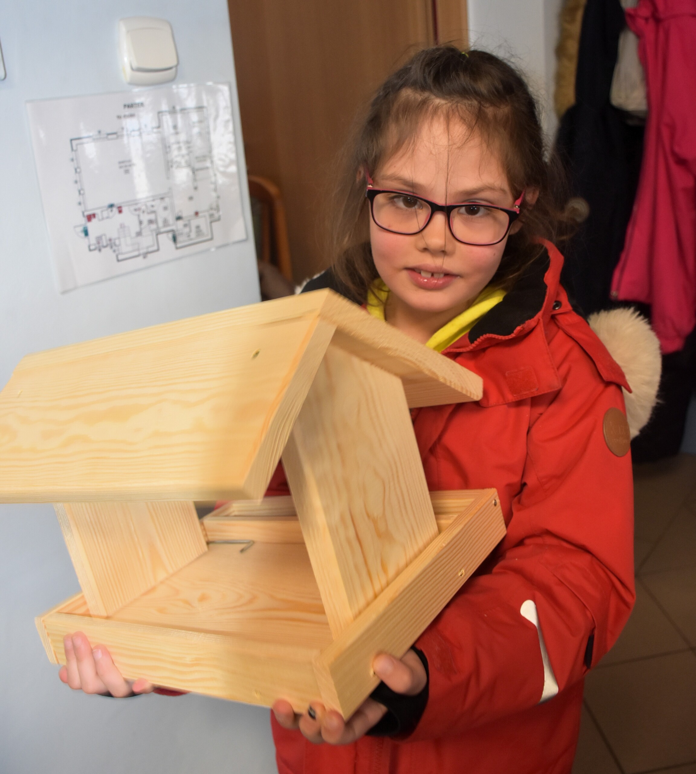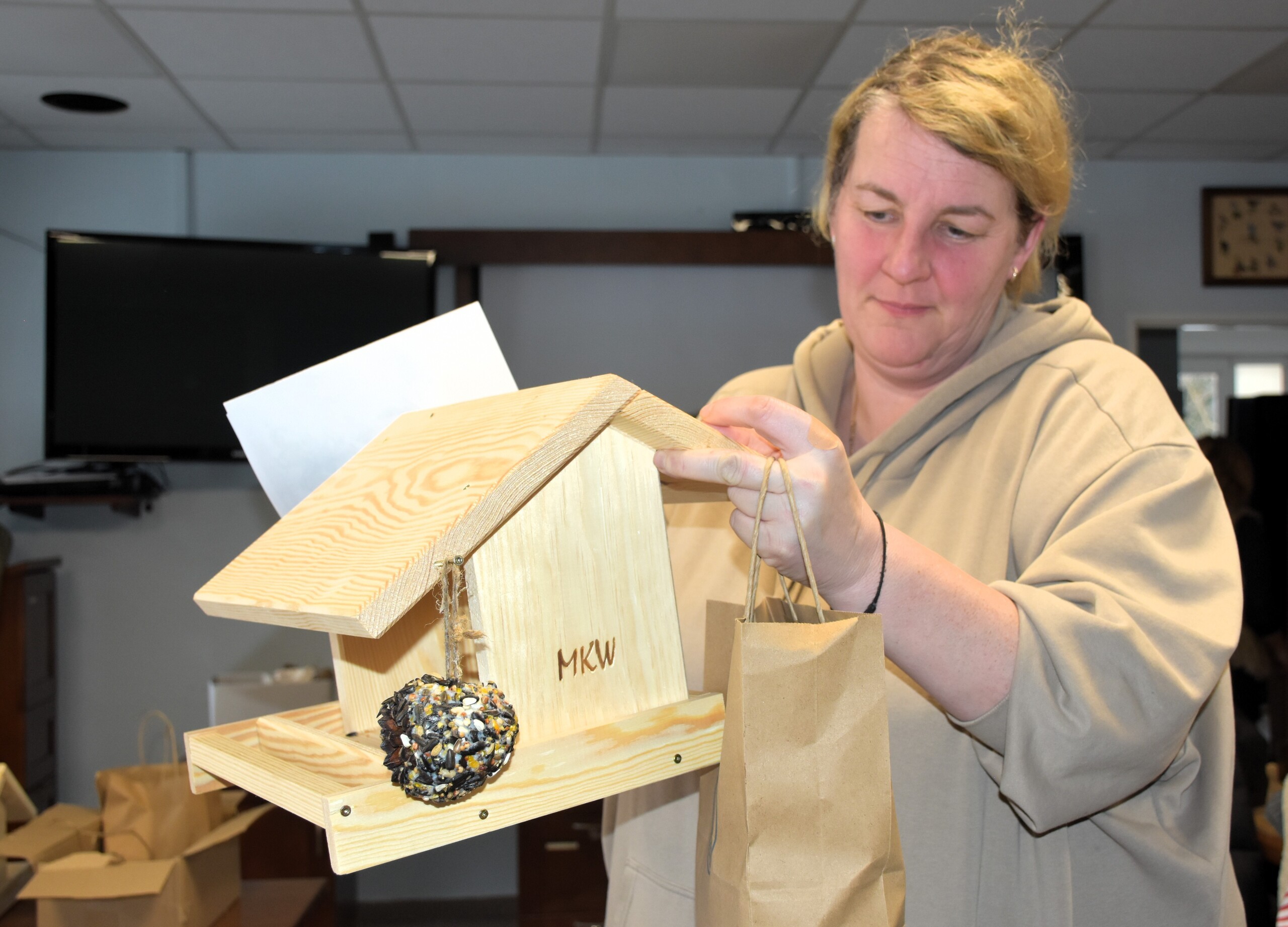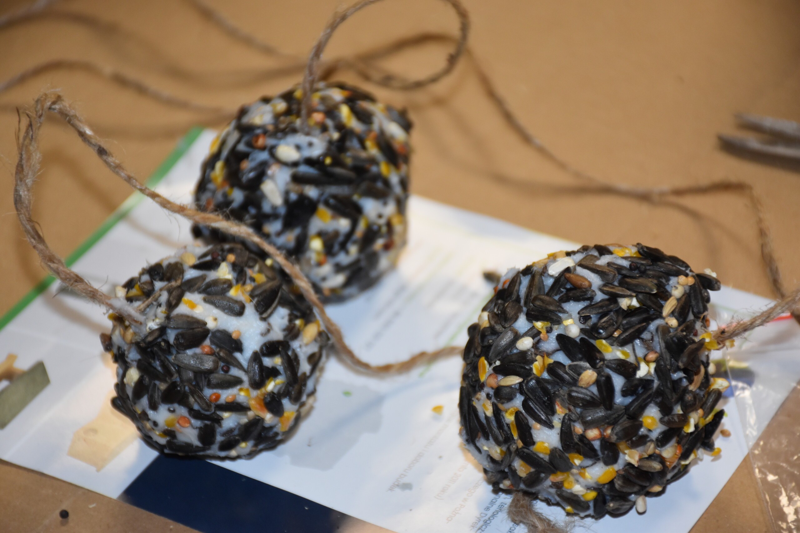 Po teorii przyszedł czas na praktykę i przystąpiono do budowy karmników. Wszyscy ochoczo zabrali się do pracy. Wkrętarki poszły w ruch, a śrubki i wkręty szybko znajdowały przypisane sobie miejsca. Z desek bardzo szybko powstawały coraz to pełniejsze karmniki. Na zakończenie zarówno na twarzach najmłodszych, jak i starszych widać było zadowolenie i dumę z wykonanego zadania. Gotowe karmniki uzupełnione zostały o ptasie smakołyki, czyli szyszki tłuszczowe z nasionami.